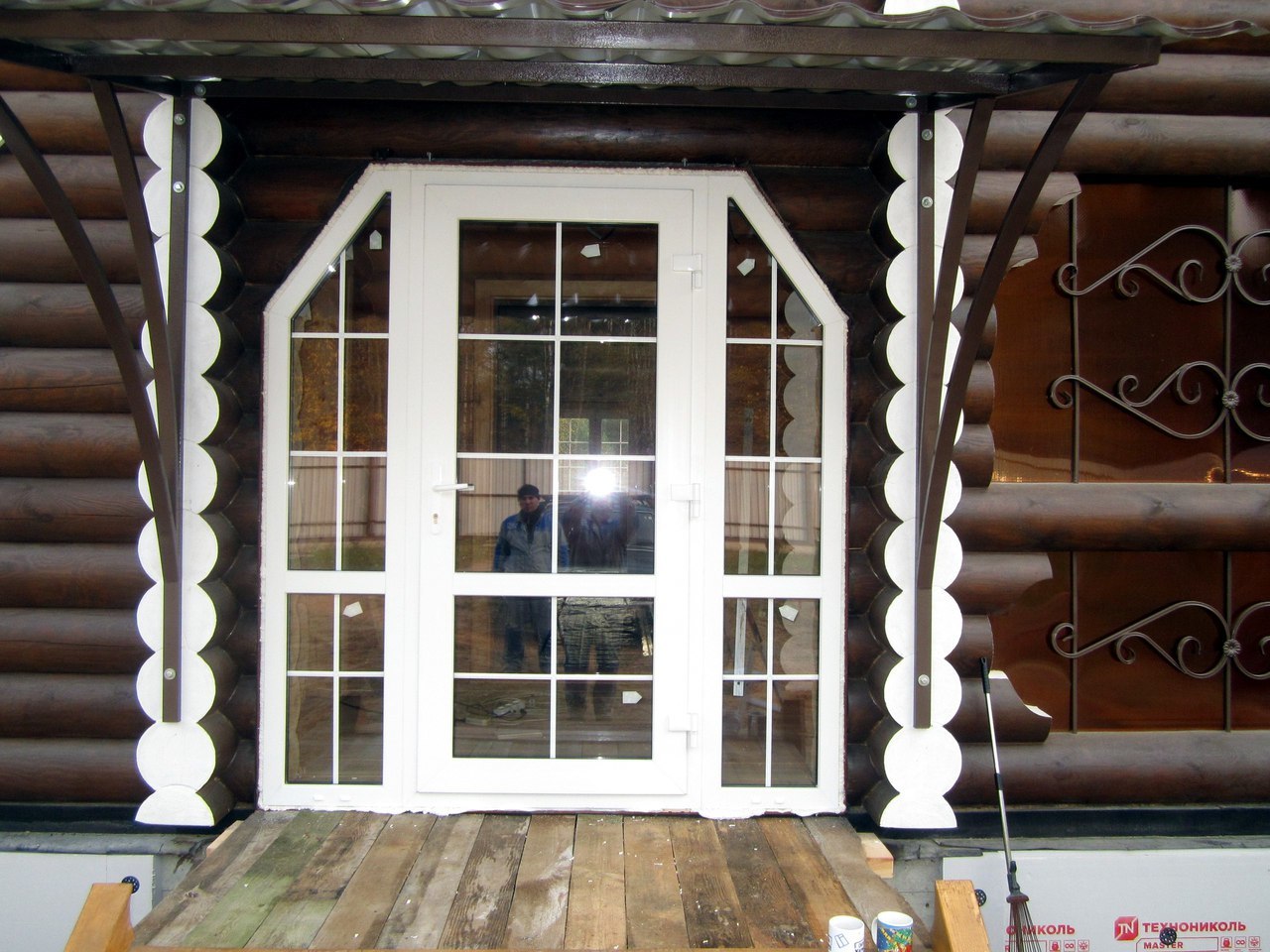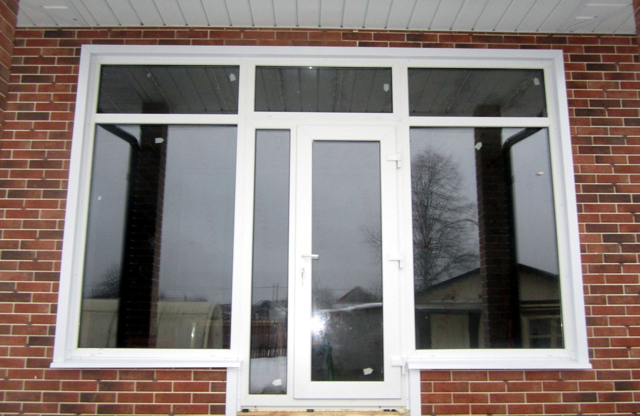 По бокам створки глухие, центральные - повортные+подоконник,отлив, козырек, нащельник.